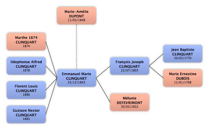 | Nephew-in-law | 15/11/1870 | Houdeng-Goegnies 7110, Hainaut, Wallonie, BELGIQUE | 3/12/1943 | Saint-Ghislain, 7330, Hainaut, Wallonie, BELGIQUE | |