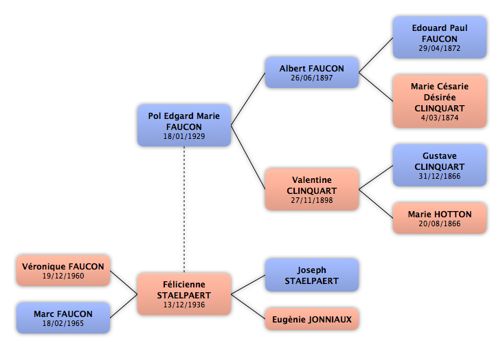 | Belle-soeur par alliance | 3/01/1930 | Houdeng-Goegnies 7110, Hainaut, Wallonie, BELGIQUE | 18/05/1996 | Haine-Saint-Paul, 7100, Hainaut, Wallonie, BELGIQUE | |