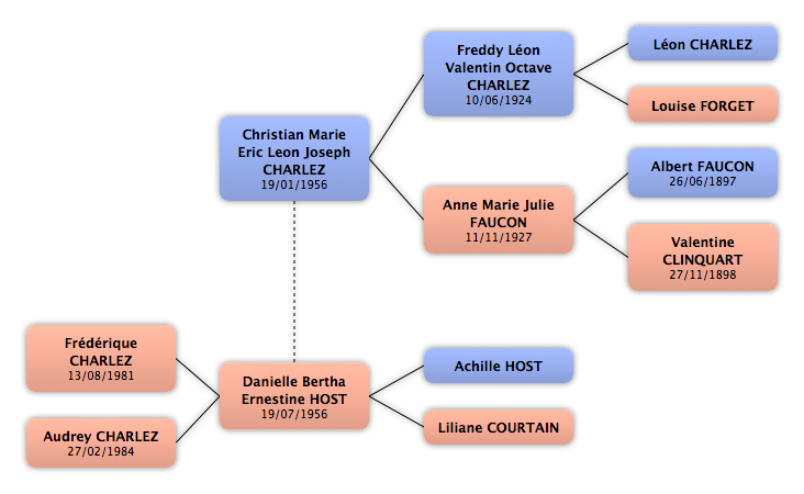 | Arrière-arrière-arrière-arrière grand-père | 27/12/1766 | Neufvilles, 7063, Hainaut, Wallonie, BELGIQUE | 27/03/1796 | Marche-Lez-Ecaussinnes, 7190, Hainaut, Wallonie, BELGIQUE | |